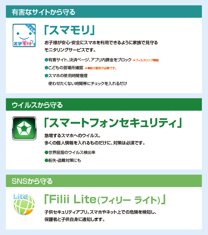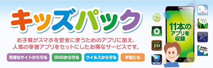 「子供を守る」をテーマにしたアプリのパックで、SNSからお子様を守るフィルタリング機能が入ったアプリ「スマモリ」、お子様のスマホ利用データやアプリを分析し、ネット上の危険にさらされていないかを検知する「Filii」など、子供を守るアプリに学習アプリなどを加えた全11タイトルが定額料金で使えるものです。