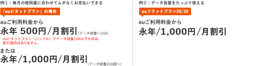 ※割引額は、月末時点で加入しているau携帯電話(タブレット・PC含む)料金プランやデータ定額サービスにより判定します。月末時点で条件を満たさない月は、割引適用されません。