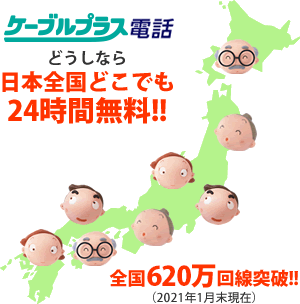 ケーブルプラス電話に加えて、ケーブルプラス光電話などへの通話も、お手続き不要で、日本全国どこでも24時間かけ放題!