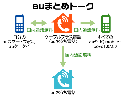 ケーブルプラス電話のご契約でご連絡先電話番号にauまたはpovo1.0をご登録されており、ケーブルプラス電話とご登録auまたはpovo1.0の契約者名もしくはご登録住所が同じ場合、すべてのauやUQ mobile・povo1.0/2.0への国内通話および、auおうち電話への通話が24時間無料になります。